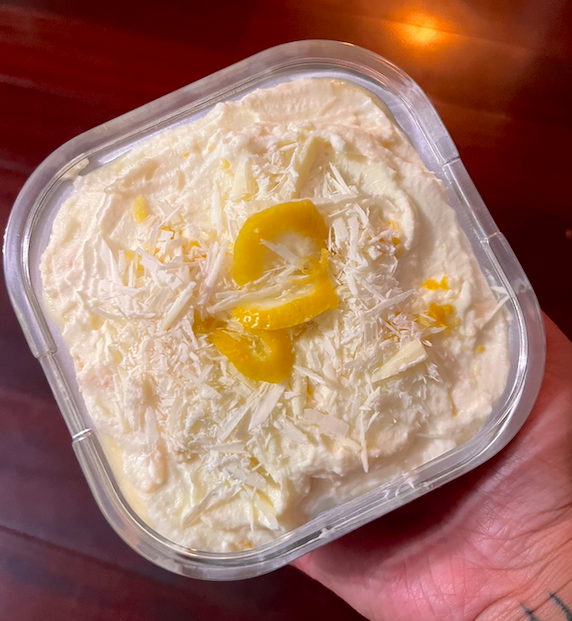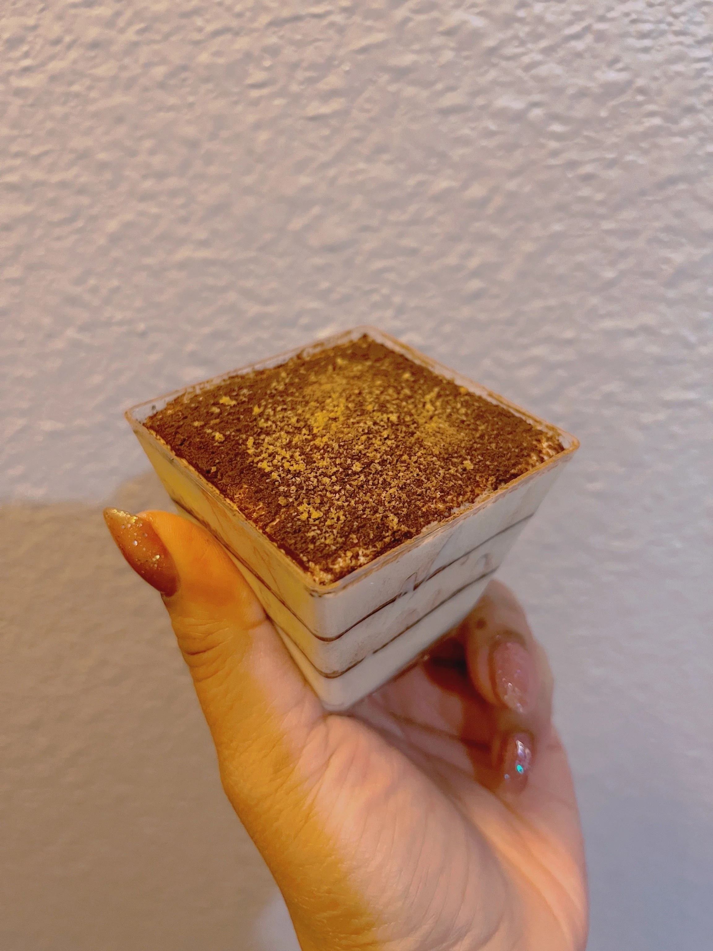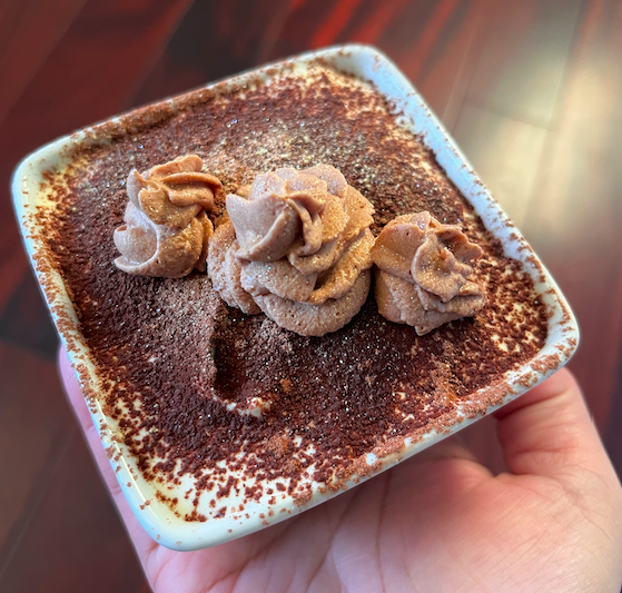 Our classic tiramisu cake is prepared with homemade dairy-free whipped cream mixed into a blend of mascarpone cream and egg custard infused with a vanilla bean syrup. Our savoiardi cakes are dipped into a delightful espresso combined with a sweet amaretto-rum liquor and then it is topped with cocoa powder.