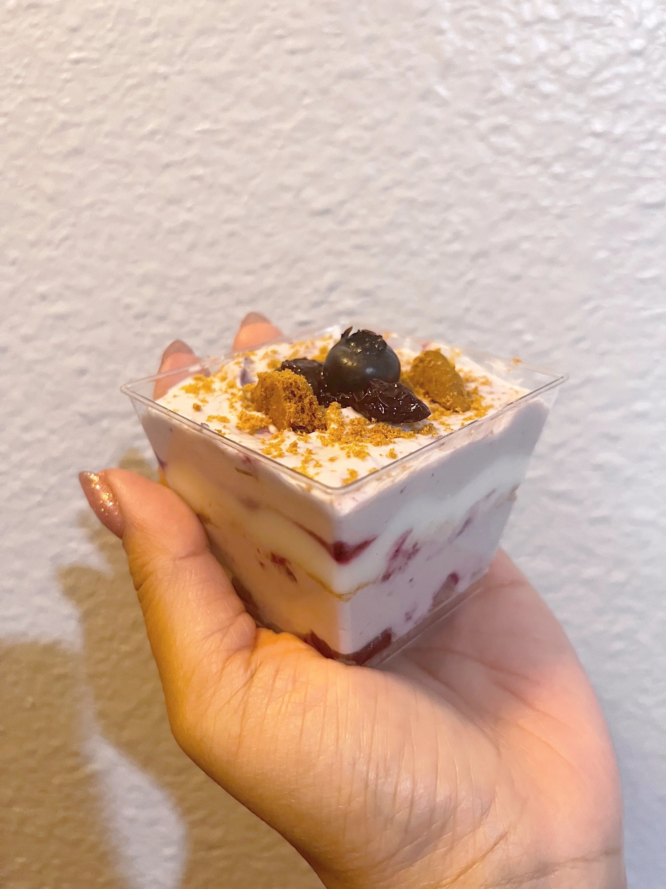 Our yummy blueberry tiramisu cake is prepared with a wonderful mix of fresh blueberries, blended into cream consisting of mascarpone, homemade whipped cream, and a sweet blueberry jam. Our savoiardi cakes are soaked into the same jam, giving the potency of the blueberry flavour. It is then layered with vanilla yogurt for balance of sweet tartness, as well as a small layer of crumbled Biscoff cookies for a crunch. The cake is then topped off with blueberries and crumbled cookies.
