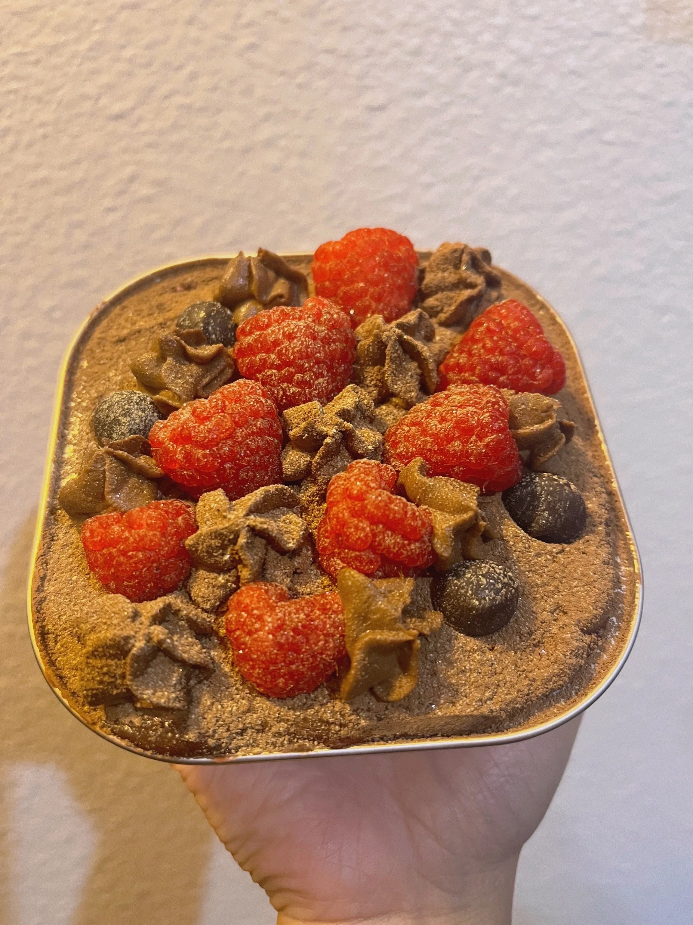 As our most popular flavour, this tiramisu cake was concocted to perfection. Our creams are prepared with homemade dairy-free whipped cream mixed into a blend of mascarpone cream and homemade egg custard infused with a rich dark chocolate, combined with the tartness of fresh raspberry compote, with our cakes dipped in espresso.